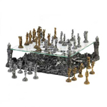 Prepare for battle and defend your kingdom with this intricate and breathtaking medieval-inspired chess set! The glass game board is held aloft by four towers of the castle, revealing the remains of previous clashes below. Warring royalty and their brave knights are in full battle regalia, complete with swords and shields, in either silver-tone or bronze- tone.